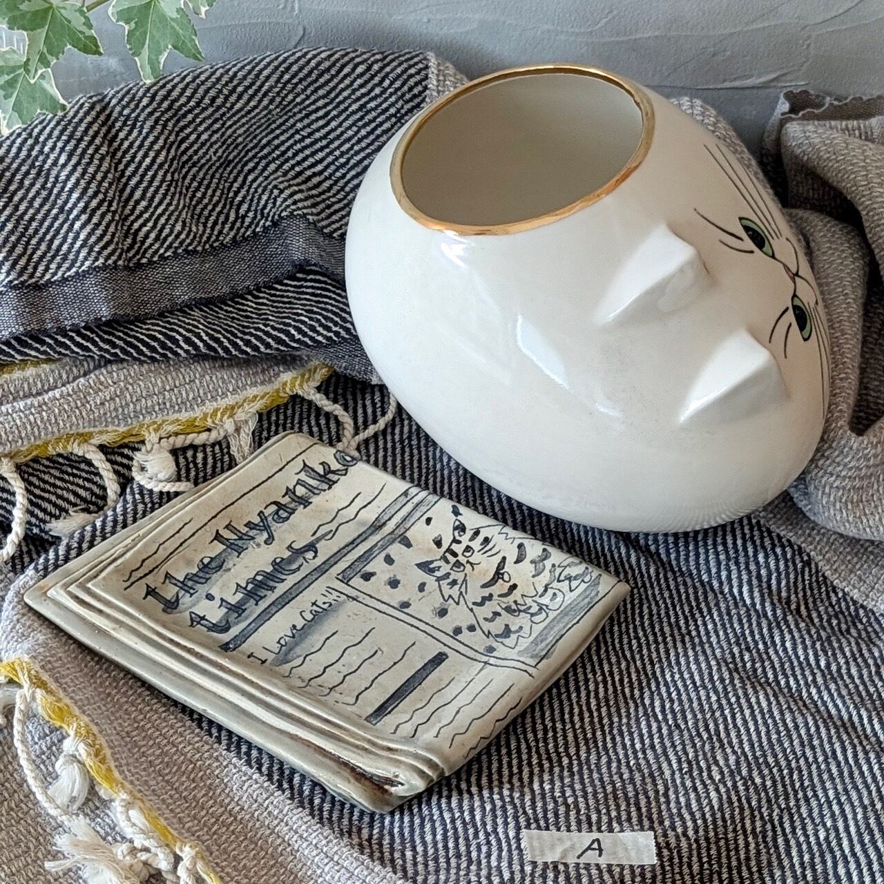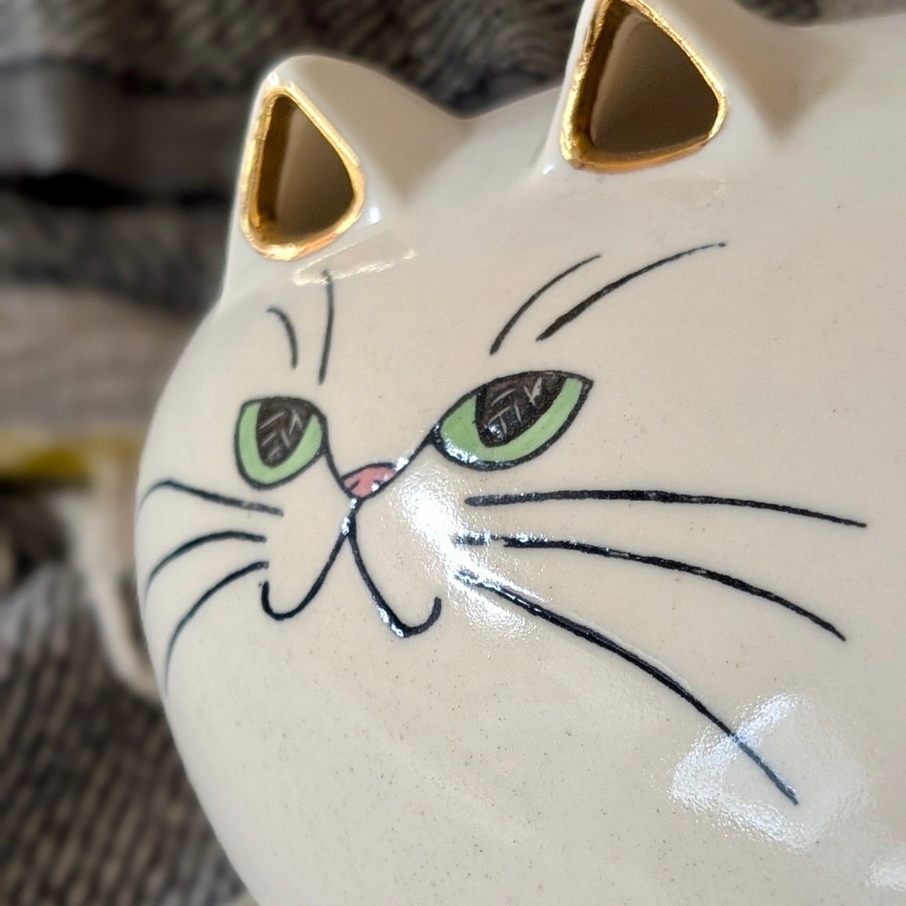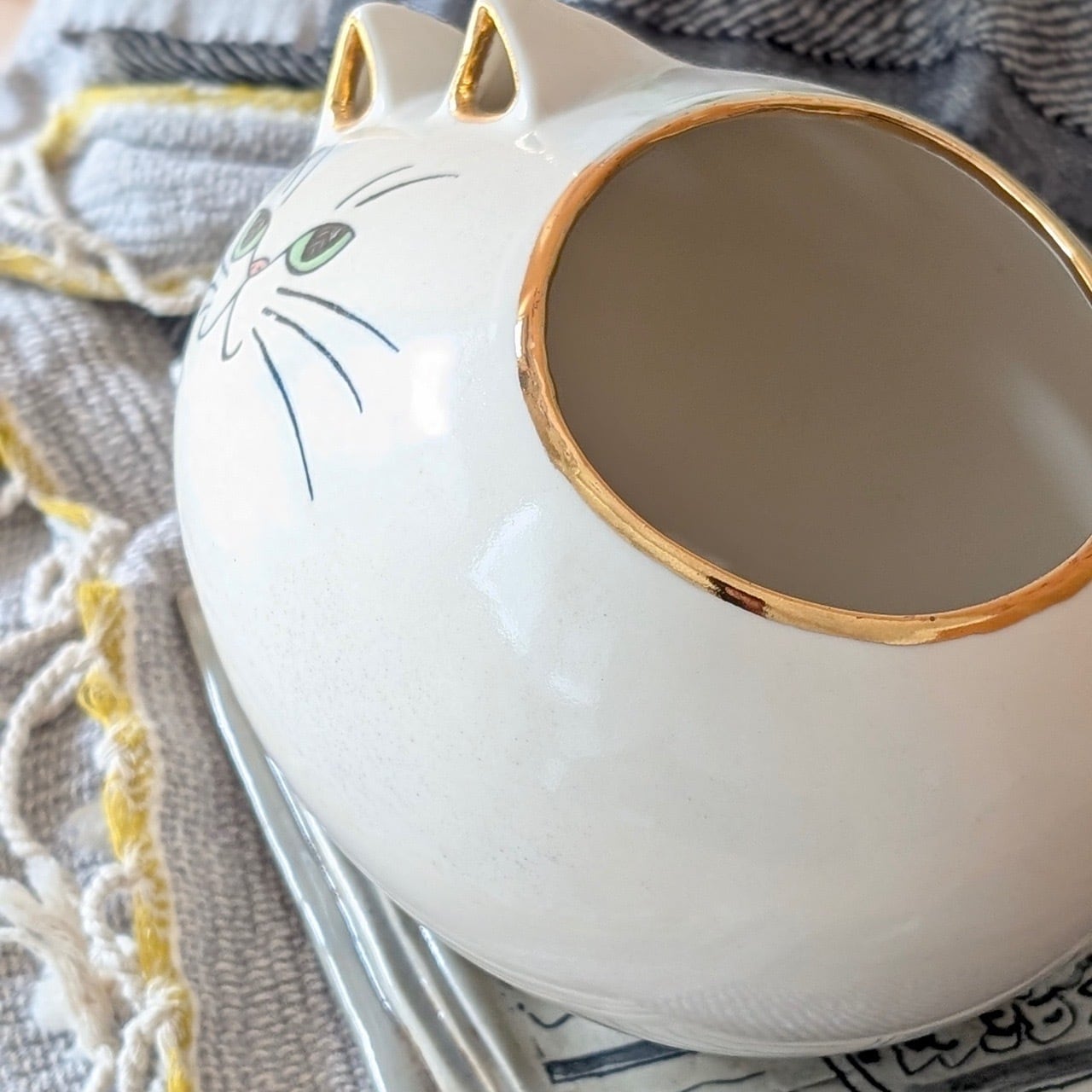 こちらは耳と丸い鉢の口のみに金の縁取りをした、艶のある透明釉をかけた白猫ちゃん。