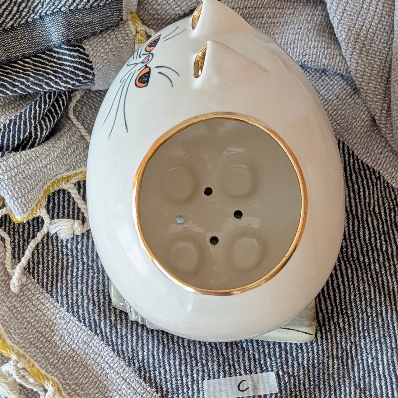 耳と丸い鉢の口のみに金の縁取りをした、艶のある透明釉をかけた白猫ちゃんです。