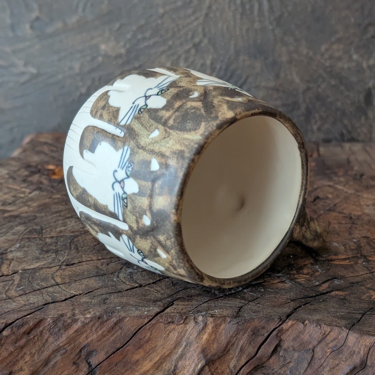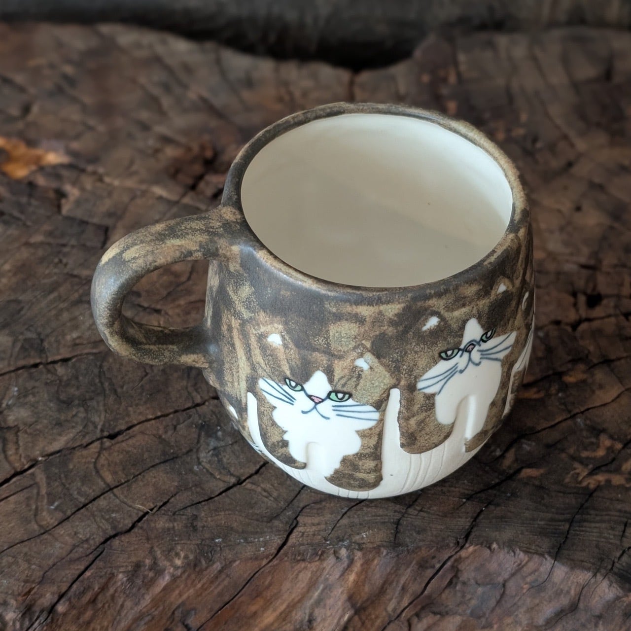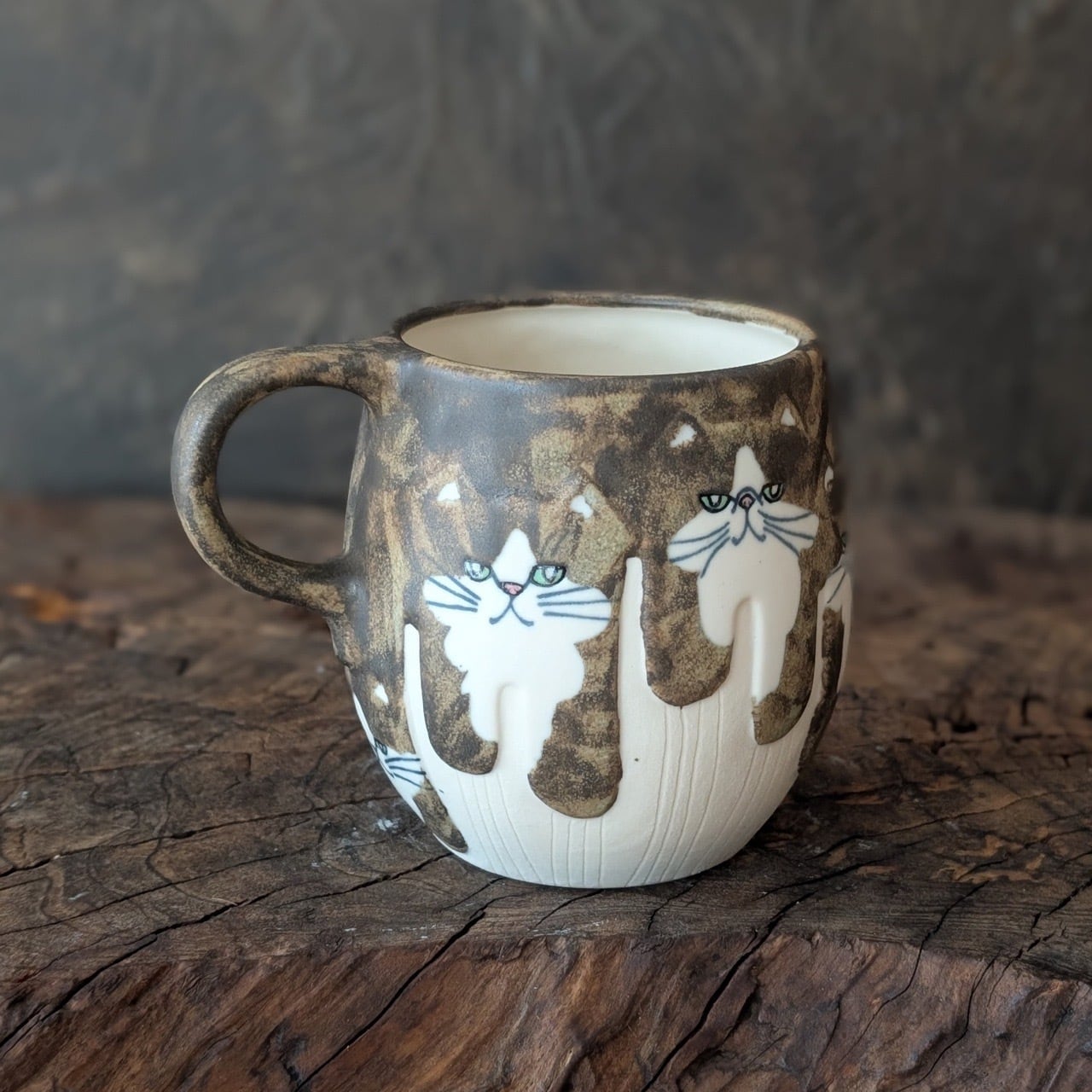 私のこだわりはハチワレちゃんの白マット部分と、壁紙に見立てた爪跡部分の白マットは異なる白マットの釉薬にしています。黒のムラ感もふわっと長毛っぽくていい雰囲気◎