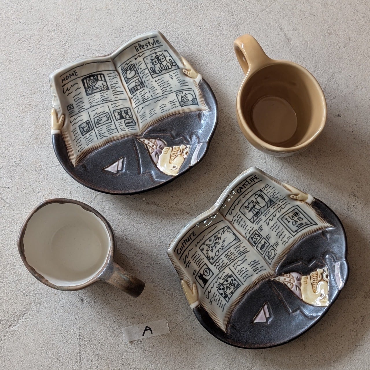 新聞を読むおじさまを”ワタシを愛でよ!!”と邪魔をする猫ちゃんの様子をモチーフにした器。