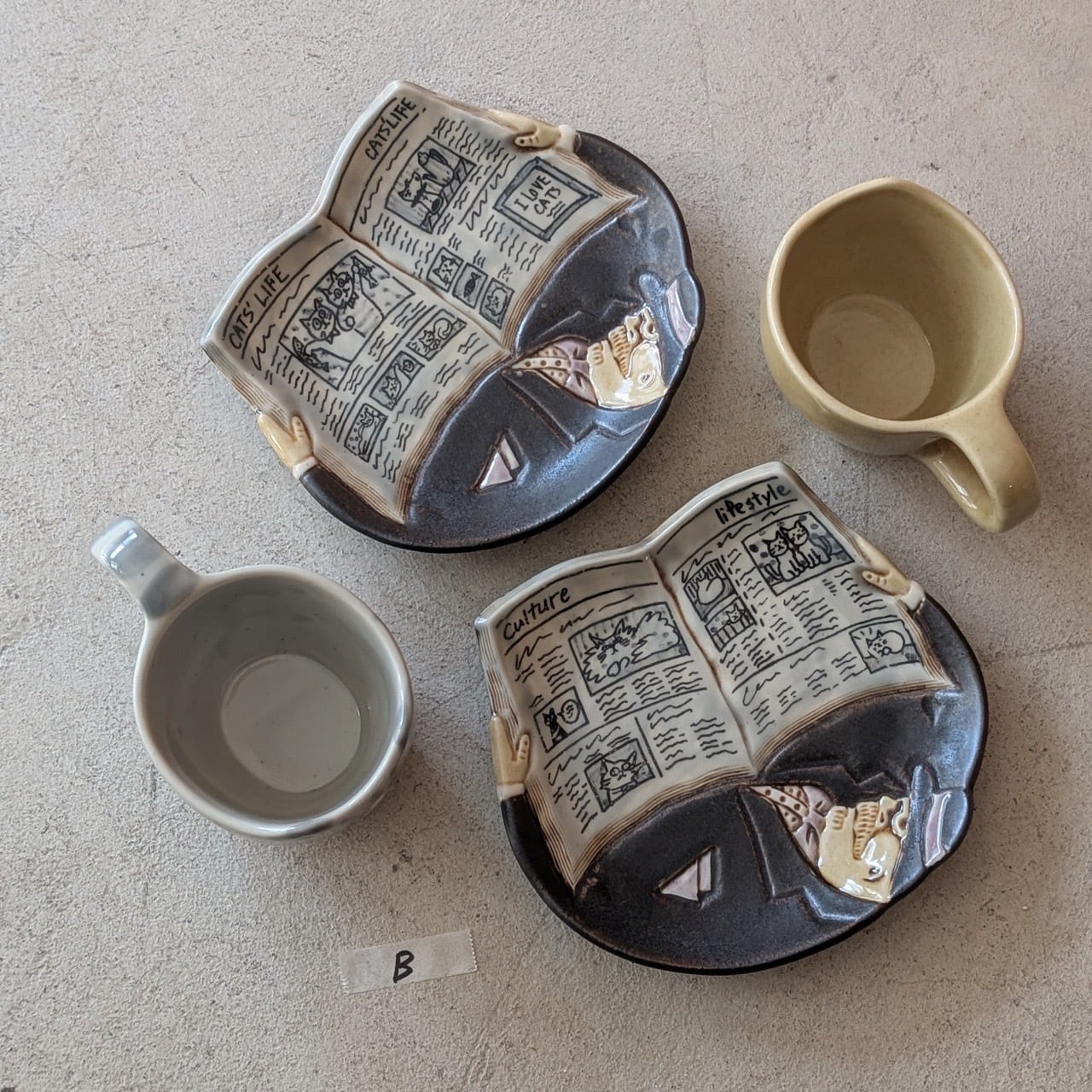 新聞を読むおじさまを”ワタシを愛でよ!!”と邪魔をする猫ちゃんの様子をモチーフにした器。
