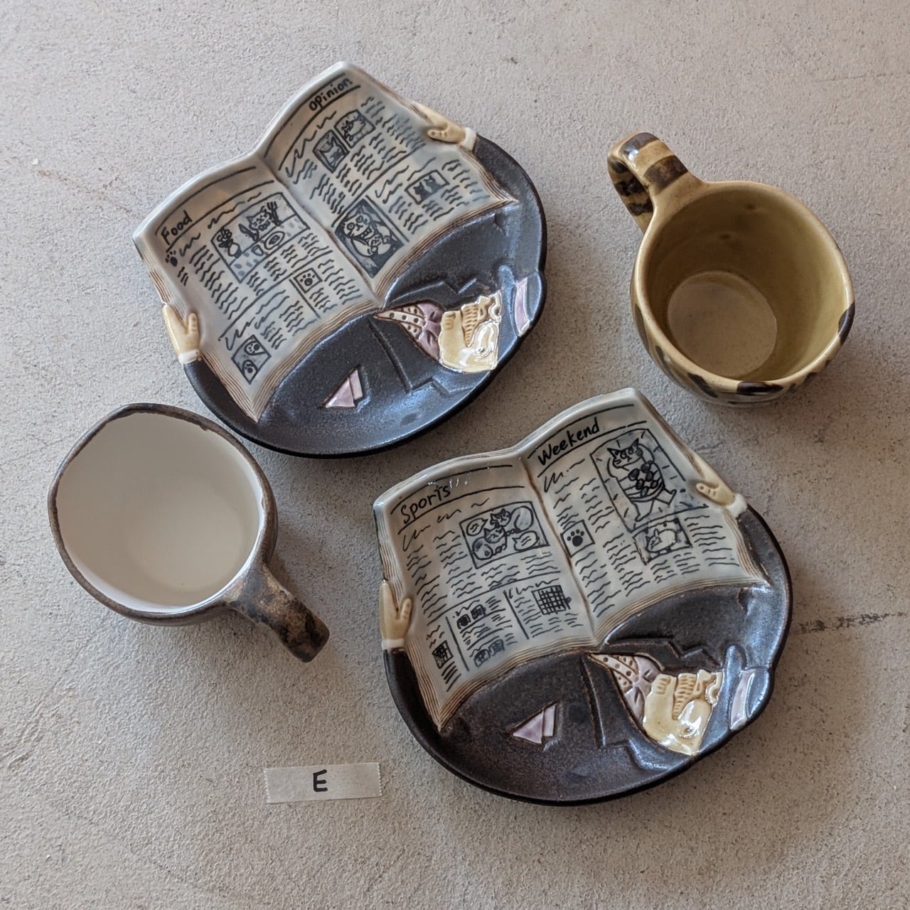 新聞を読むおじさまを”ワタシを愛でよ!!”と邪魔をする猫ちゃんの様子をモチーフにした器。