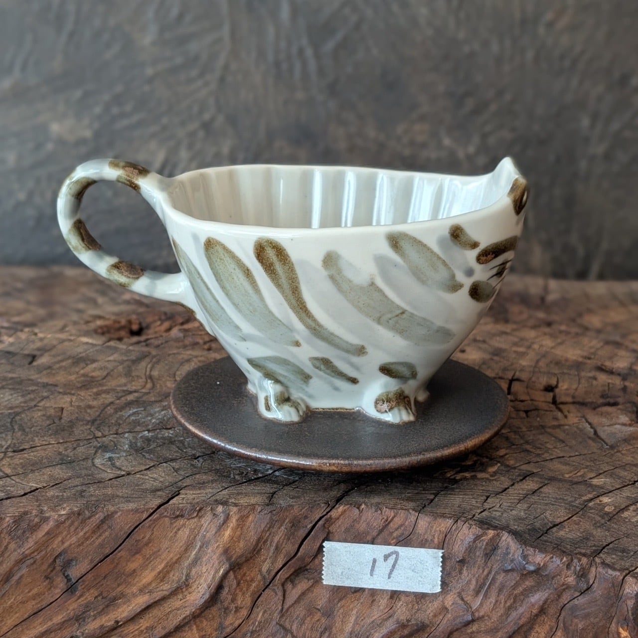 型制作で作ってます。抜いた生地個々に微妙な差もあり、ドリップにゃんでのコーヒーの淹れ方はちょっと研究してもらうことになりますが、楽しんでもらえるフォルムになったと思います。
