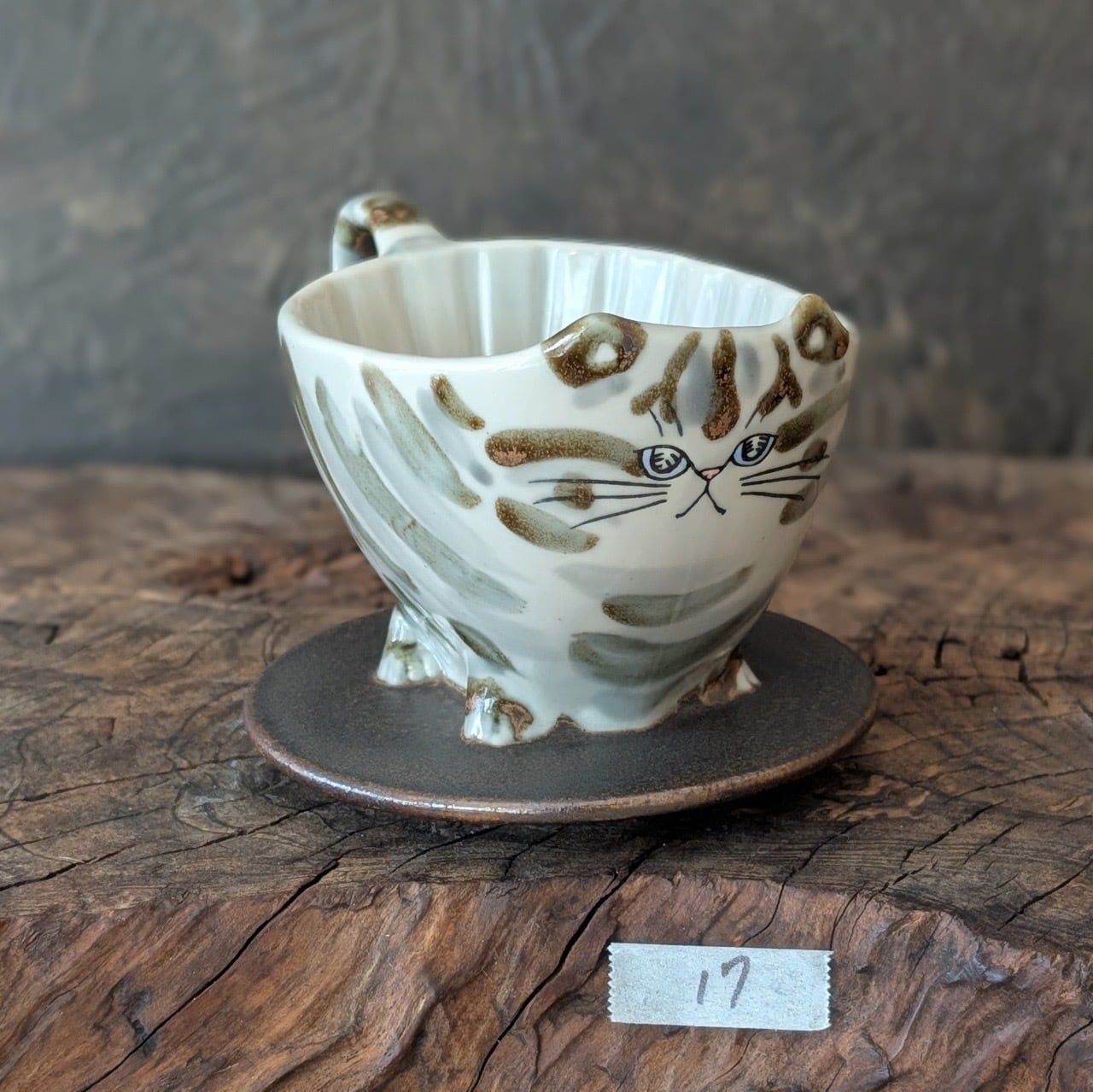 ・ドリップにゃんは型成形になるので、3〜5個の石膏型を合わせて作ります。各面の型の合わさるところで、顔面・尻尾にも線が薄ら見えるところがあります。