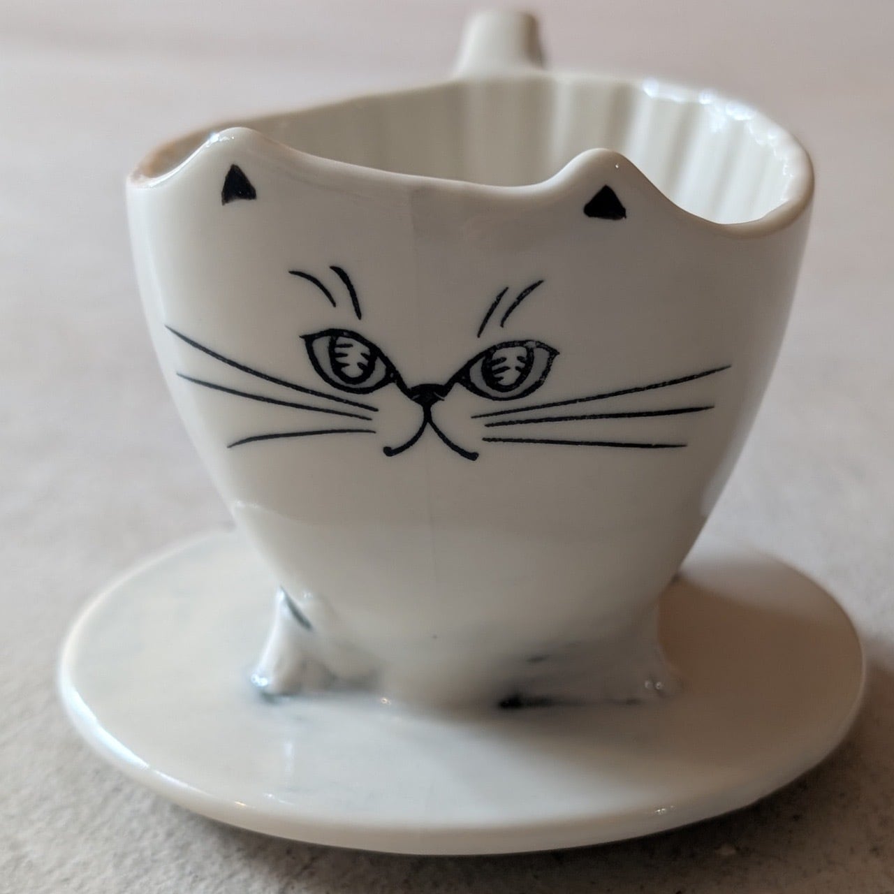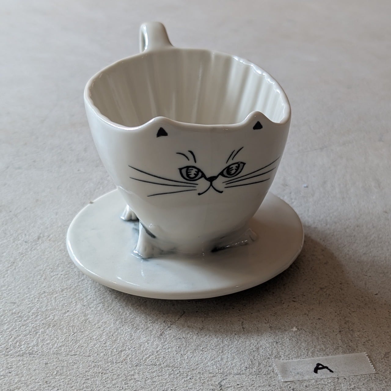 ・ドリップにゃんは型成形になるので、3〜5個の石膏型を合わせて作ります。各面の型の合わさるところで、顔面・尻尾にも線が薄ら見えるところがあります。