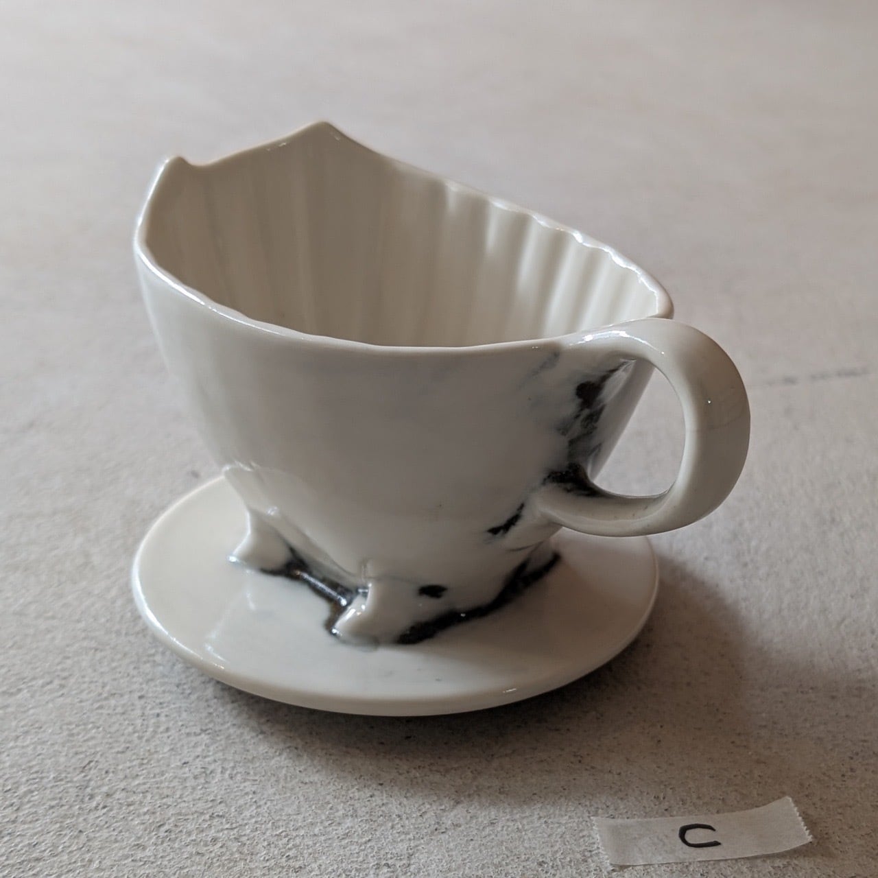 ・ドリップにゃんは型成形になるので、3〜5個の石膏型を合わせて作ります。各面の型の合わさるところで、顔面・尻尾にも線が薄ら見えるところがあります。
