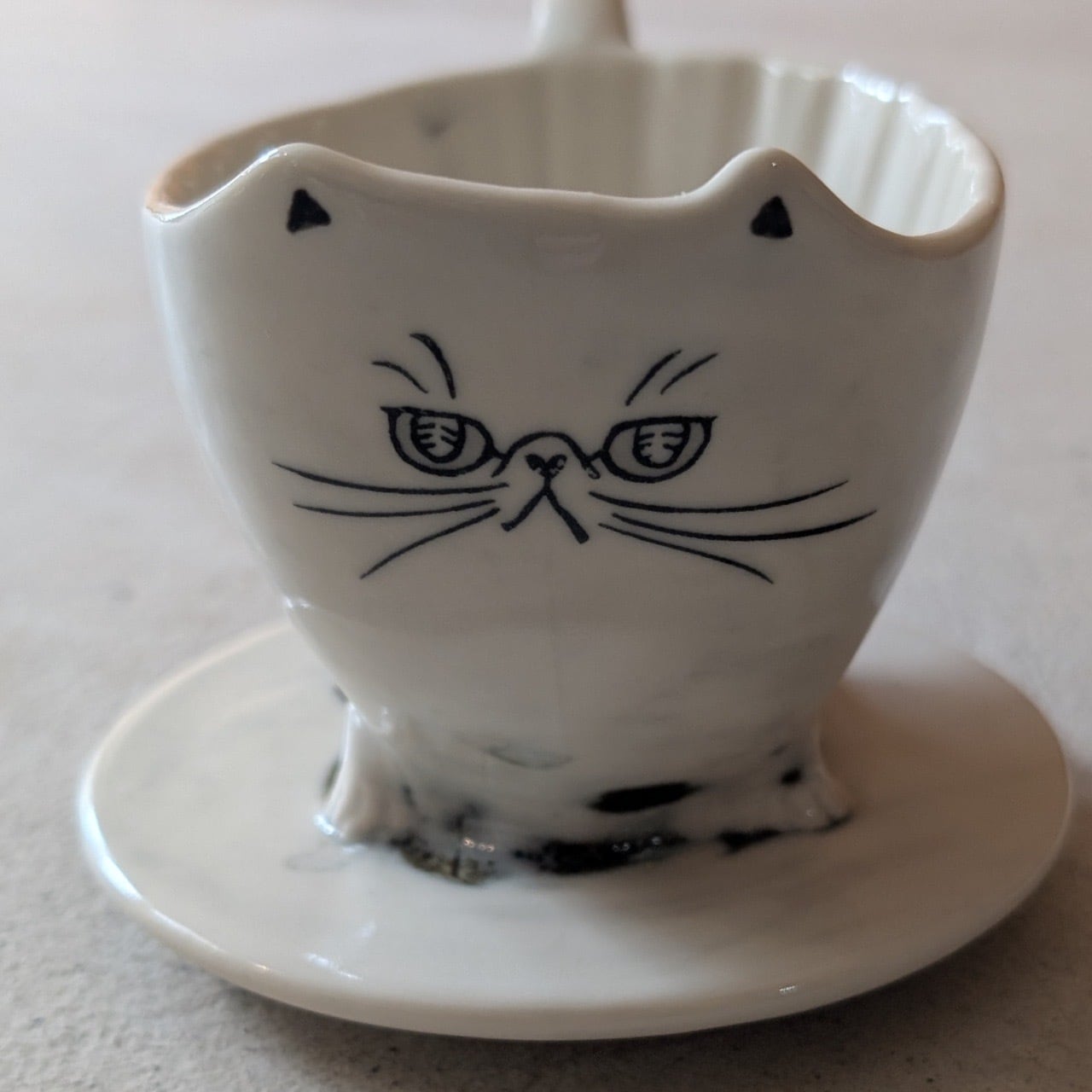 ・ドリップにゃんは型成形になるので、3〜5個の石膏型を合わせて作ります。各面の型の合わさるところで、顔面・尻尾にも線が薄ら見えるところがあります。